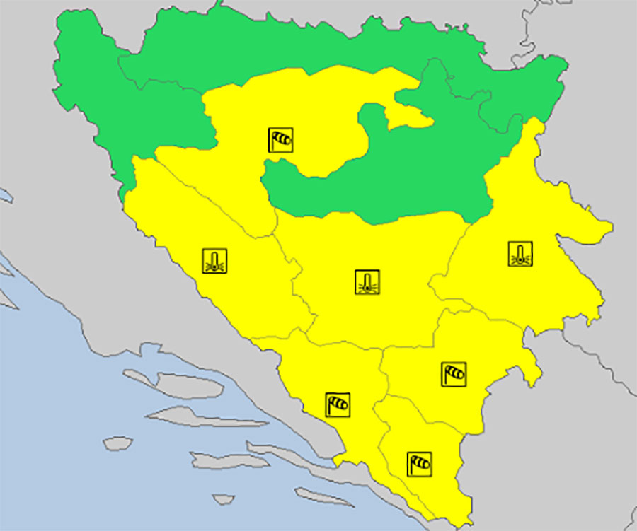 Za gotovo cijelo područje Bosne i Hercegovine danas je upaljen žuti meteoalarm.
