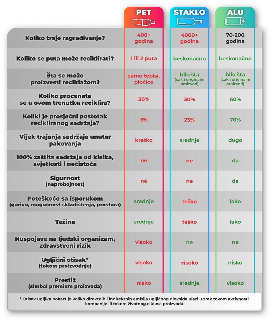Kako je plastika postala jedan od najvećih zagađivača današnjice, mnoge kompanije se okreću aluminijumu kao sirovini za izradu ambalaže. Aluminijum je jedan od najvrjednijih materijala koji se mogu beskonačno reciklirati i nudi privlačan poticaj za ekonomično i održivo ponovno korištenje, a i za znatno smanjenje otpada. U nastavku neke od bitnih činjenica vezanih za aluminijum.