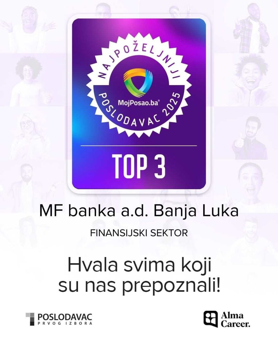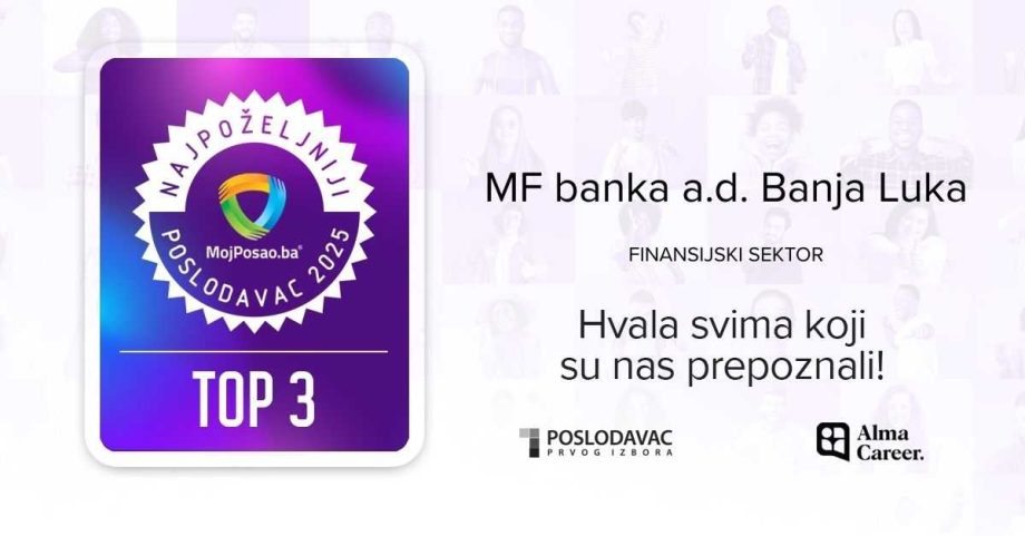 MF banka je ostvarila izuzetan rezultat u okviru najrelevantnijeg istraživanja tržišta rada u našoj zemlji. Prema rezultatima projekta „Najpoželjniji poslodavac 2025“, koji već 19 godina provodi kompanija Alma Career BH (portal MojPosao.ba), MF banka je uvrštena u TOP 10 najpoželjnijih poslodavaca u Bosni i Hercegovini, dok je u izuzetno jakoj konkurenciji finansijskog sektora zauzela visoko treće mjesto.