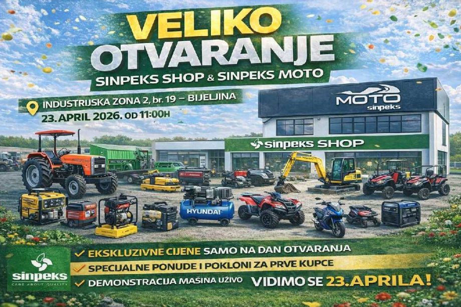 Svečano otvaranje objekta Sinpeks Shop & Sinpeks Moto biće održano 23. aprila 2026. godine sa početkom u 11 časova, na adresi Industrijska zona 2, broj 19.