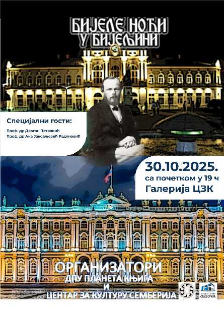U Galeriji Centra za kulturu „Semberija“ u Bijeljini, 30. oktobra biće održan kulturni događaj „Bijele noći u Bijeljini“, posvećen liku i djelu velikana ruske i svjetske književnosti Fjodora Mihajloviča Dostojevskog i sudbini buduće Rusije.