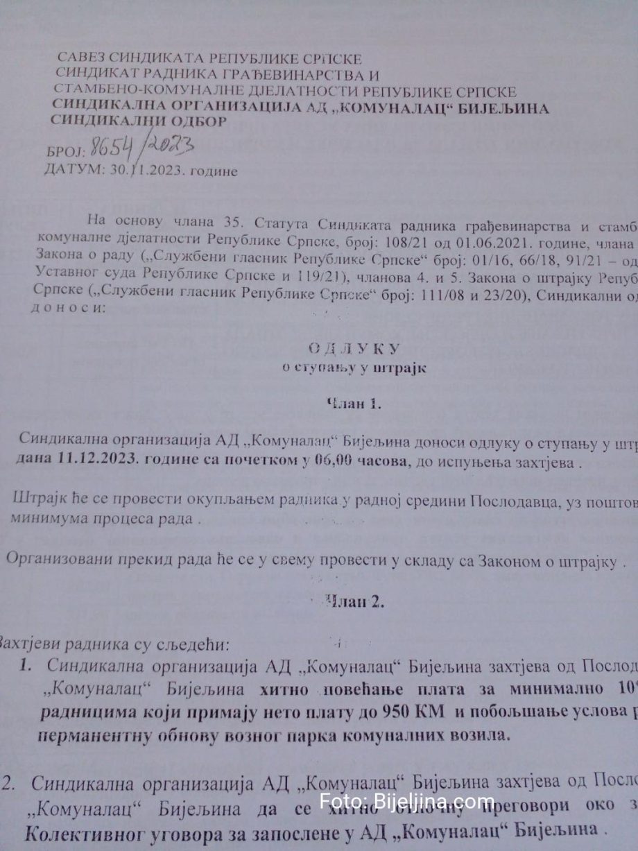 Sindikalna organizacija bijeljinskog „Komunalca“, čiji su radnici jutros u šest sati stupili u štrajk, od poslovodstva ovog preduzeća zahtijeva hitno povećanje plata, minimalno za 10%, svim radnicima koji primaju neto platu do 950 KM i poboljšanje uslova rada kroz permanentu obnovu voznog parka komunalnih vozila.