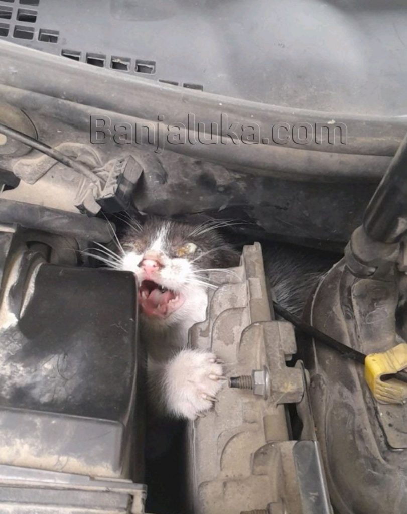 Kada je sinoć Saša Čekrlija krenuo da upali svoj automobil ispred zgrade u Cara Lazara 34, začuo je mjaukanje ispod haube.