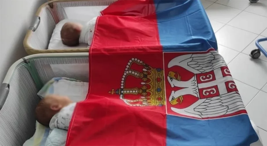 Na fotografiji se vide dvije tek rođene bebe koje su prekrivene srpskom trobojkom.