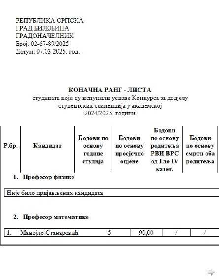 Gradska uprava Bijeljina je objavila konačnu rang-listu studenata koji su ispunili uslove Konkursa za dodjelu studentskih stipendija u akademskoj 2024/2025. godini