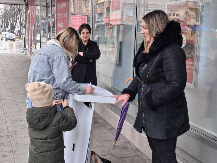 Na Gradskom trgu u Bijeljini, uprkos hladnom i kišovitom vremenu, danas je organizovano potpisivanje peticije za povećanje subvencija za boravak djece u bijeljinskim privatnim vrtićima.
