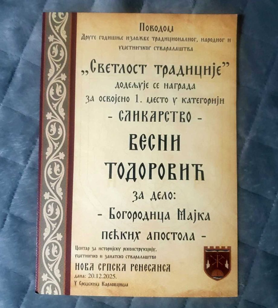 Priznanje je uručeno u okviru manifestacije koju organizuje Centar za istorijsku rekonstrukciju, umjetničko i zanatsko stvaralaštvo “Nova srpska renesansa“, a svečanost dodjele nagrada održana je 20. decembra 2025. godine u Sremskim Karlovcima.