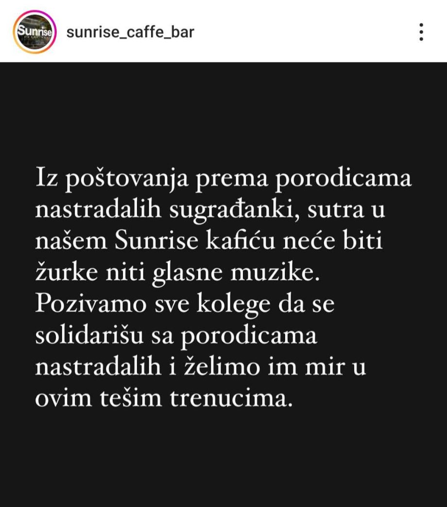 “Iz poštovanja prema porodicama nastradalih sugrađanki, sutra u našem ‘Sunrise’ kafiću neće biti žurke niti glasne muzike. Pozivamo sve kolege da se solidarišu sa porodicama nastradalih i želimo im mir u ovim teškim trenucima”, naveli su iz ovog bijeljinskog kafića.