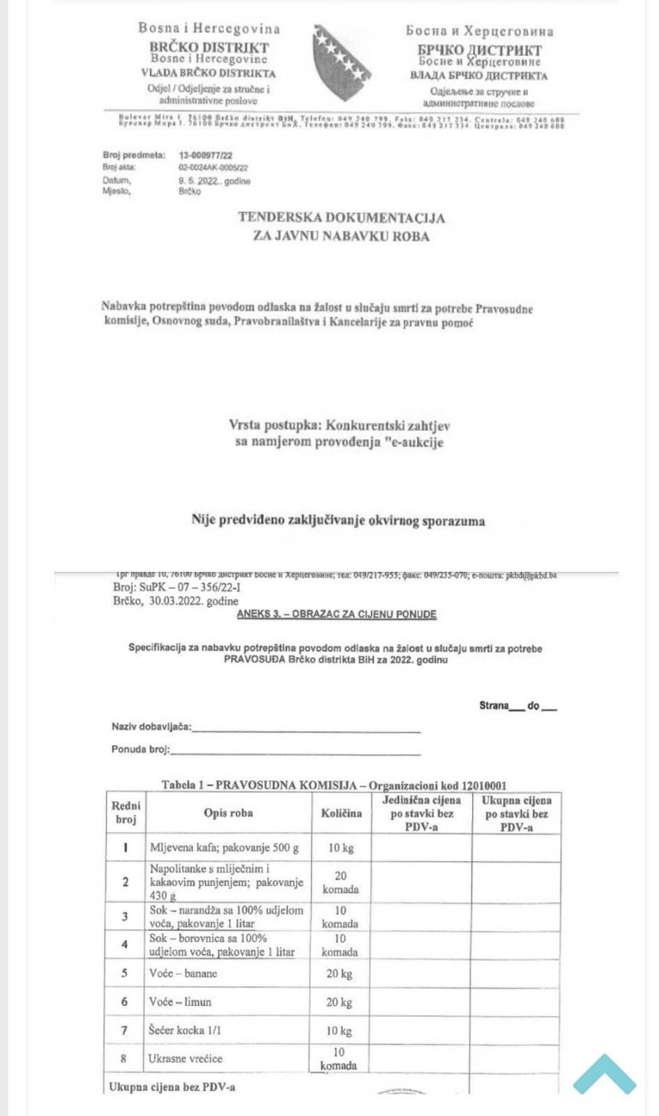 Naime, Vlada Brčko Distrikta 09. maja ove godine raspisala je tender za javnu nabavku „potrepština povodom odlaska na žalost u slučaju smrti“ nekog od zaposlenih u Pravosudnoj komisiji, Osnovnom sudu, Pravobranilaštvu i Kancelariji za pravnu pomoć.