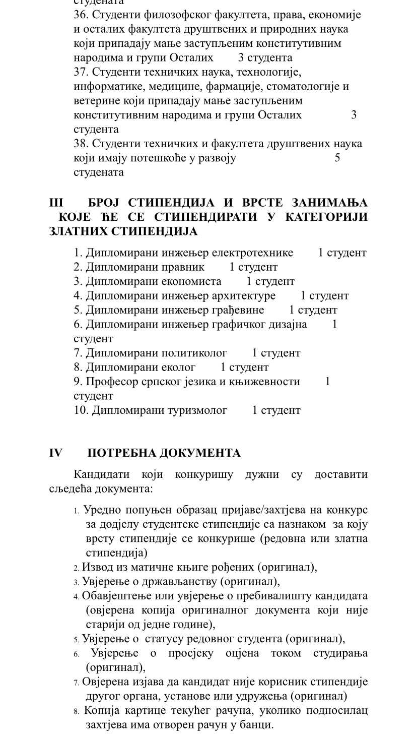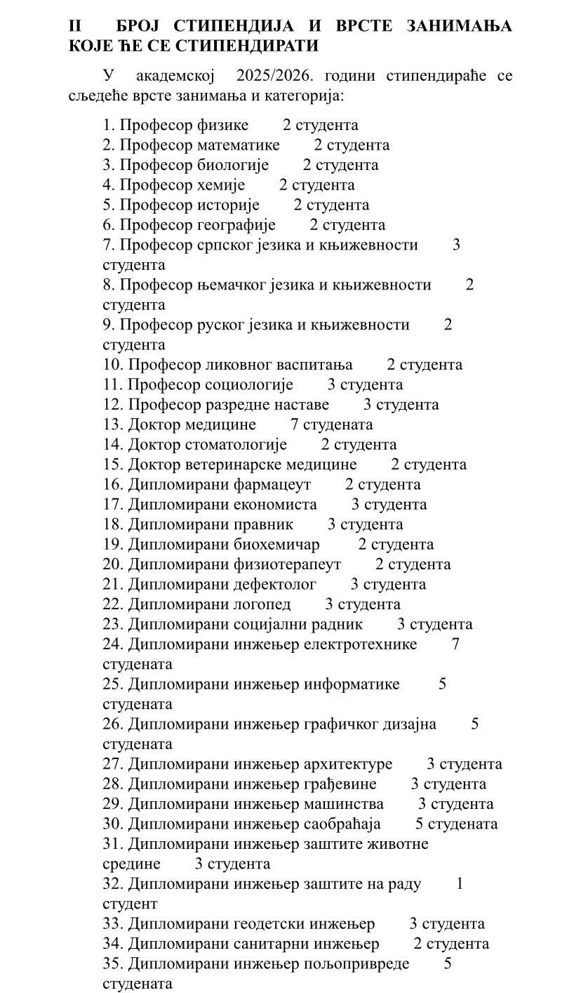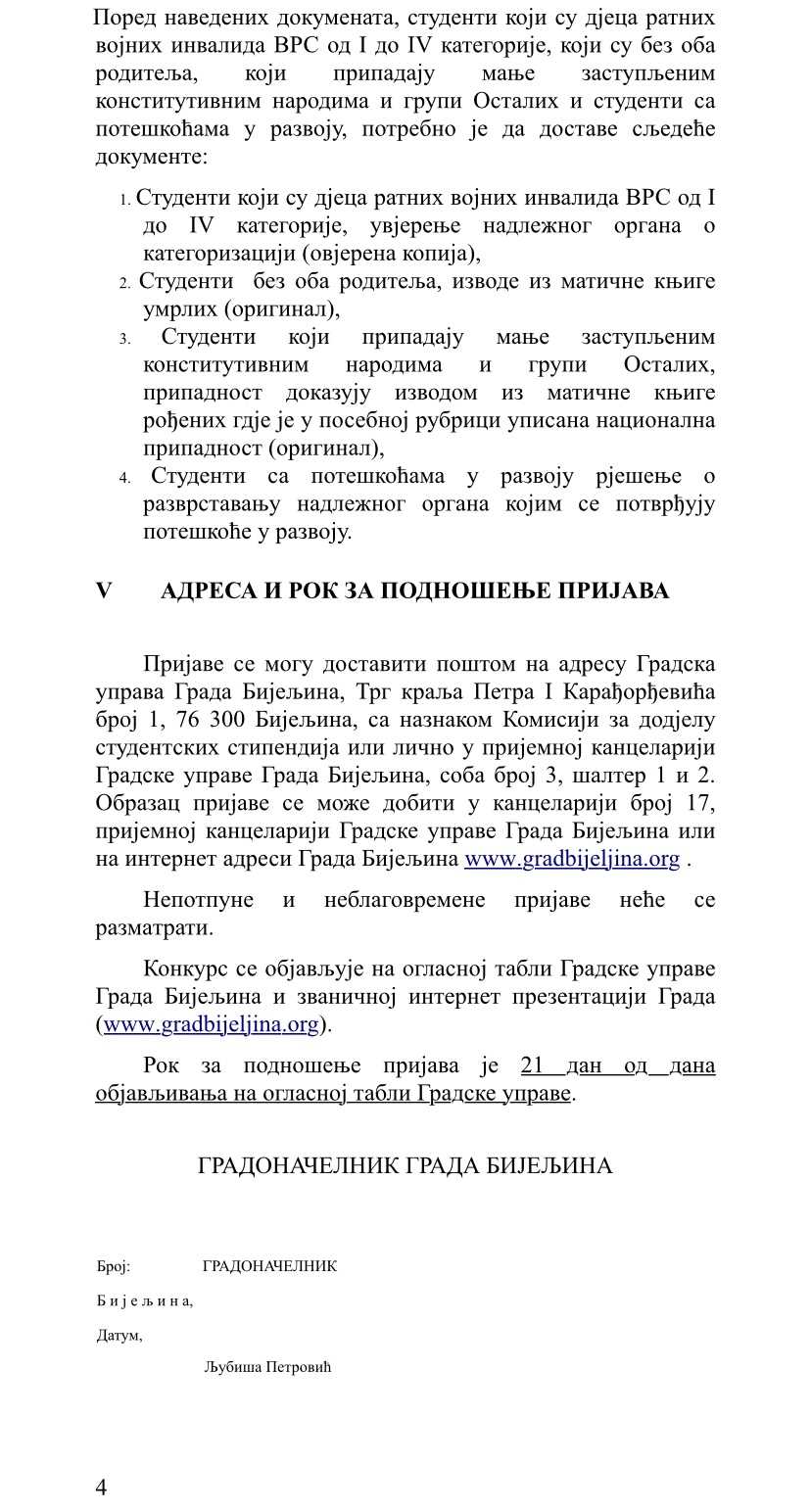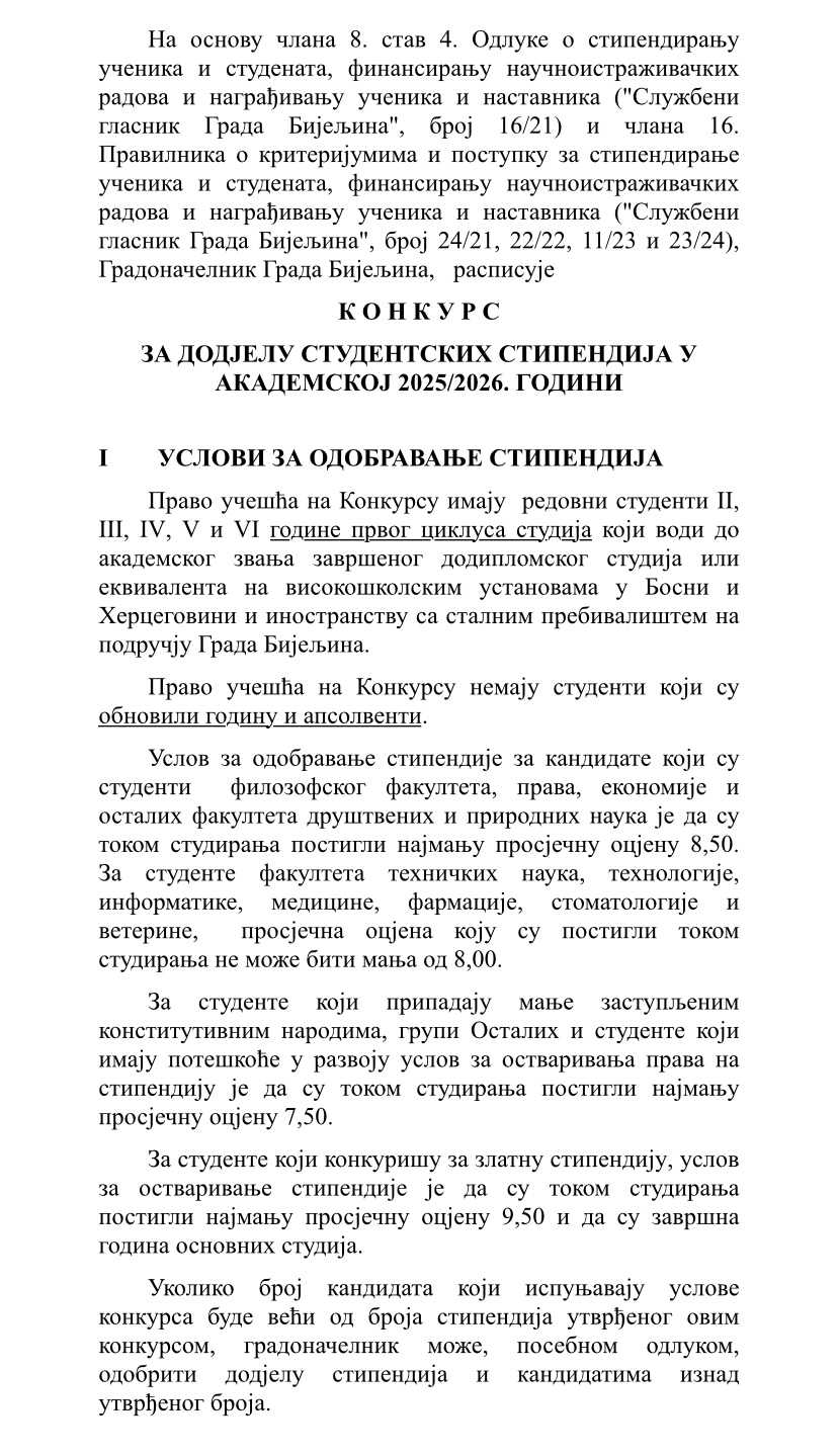 Gradonačelnik Grada Bijeljina raspisao je Konkurs za dodjelu studentskih stipendija u akademskoj 2025/2026. godini, na osnovu važeće Odluke o stipendiranju učenika i studenata i Pravilnika o kriterijumima i postupku za stipendiranje.