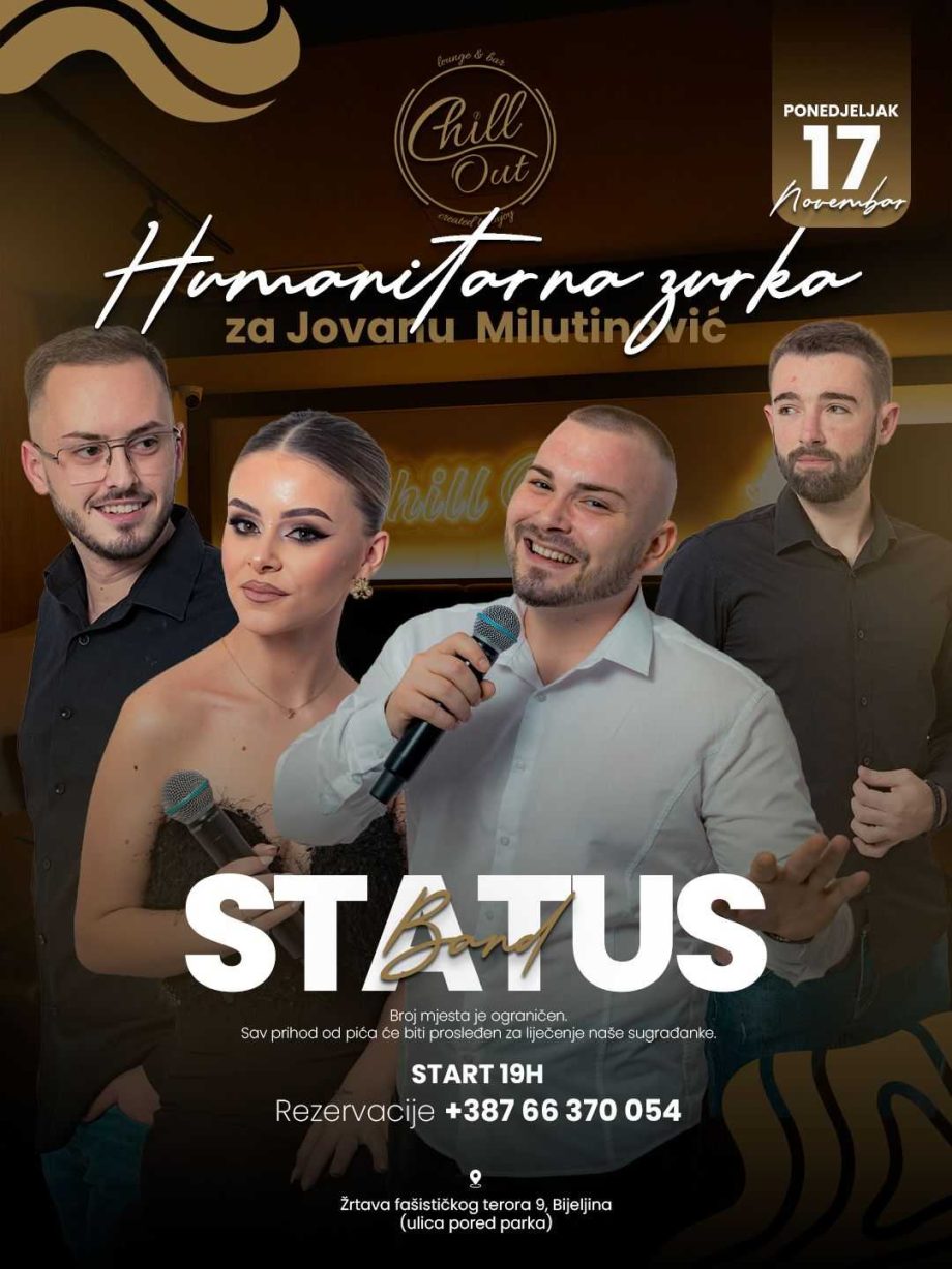 U ponedjeljak, 17. novembra, u poznatom bijeljinskom lounge & baru “Chill Out” biće održano humanitarno veče uz nastup „Status benda“.