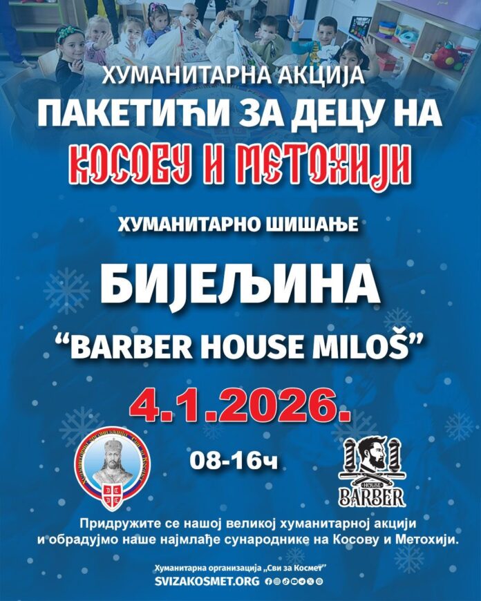 Humanitarna organizacija „Svi za Kosmet“ i „Barber House Miloš“ pozivaju sve građane Bijeljine da 4. januara 2026. godine budu dio velike humanitarne akcije, čiji je cilj prikupljanje sredstava za paketiće za djecu na Kosovu i Metohiji – kako bi zajedno uljepšali njihove praznike i izmamili što više dječijih osmijeha.