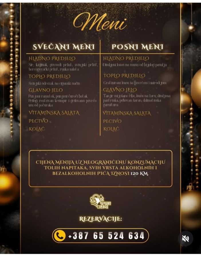 Posebna pažnja posvećena je i gastronomskoj ponudi. Gosti će imati mogućnost izbora između svečanog i posnog menija, pažljivo osmišljenih za novogodišnju noć, dok cijena dočeka iznosi 120 KM po osobi, uz all inclusive ponudu i neograničenu konzumaciju toplih napitaka, bezalkoholnih i alkoholnih pića.