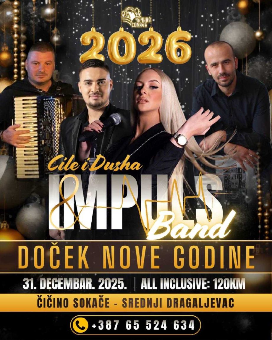 Za doček Nove godine, 31. decembra, u Čičinom sokačetu nastupiće Impuls band Cile i Duša, bend koji je publici dobro poznat po energičnim nastupima i repertoaru koji podiže atmosferu od prvih taktova. Organizatori najavljuju veče ispunjeno muzikom, veseljem i pozitivnom energijom, u ambijentu koji je već prepoznat kao jedno od omiljenih mjesta za okupljanje i slavlje nadomak Bijeljine.