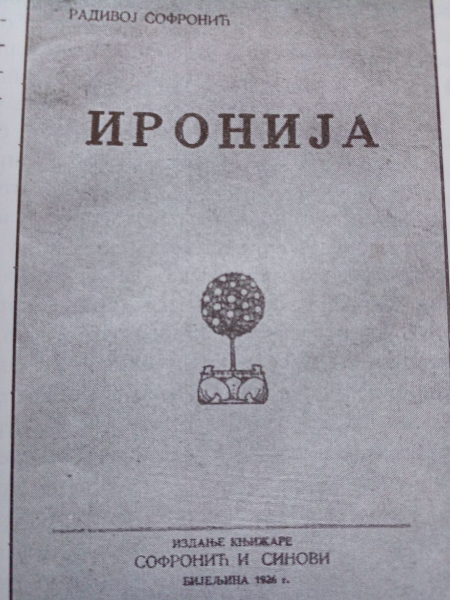 Sofronićeva knjiga novela odštampana u izdanju Knjižare “Sofronić i sinovi”, u Štampariji “Ujedinjenje” u Beogradu. U pitanju je nevelika knjiga, od pedesetak stranica, kako je zabilježio hroničar i književni stvaralac Slobodan Petrović, simpatičnog formata i broširanog poveza. Koliko se zna, to je prva objavljena knjiga u Bijeljini. Sofronićeva “Ironija” skoro da je zaboravljena i teško se može naći u knjižnim fondovima i nekih većih biblioteka.