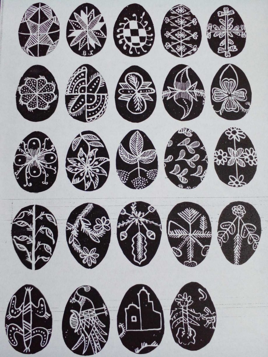Ornamenti su uglavnom stilizovanicvjetovi, rjeđe geometrijski motivi. Drugi način šaranja jaja je da se koncem uveže cvijet ili list za jaje, te ga tek tada boje. Šare, na oba načina šarane, nakon bojenja ostaju bijele. Na Veliki petak ujutru, prije izlaska sunca, ili uveče po njegovom zalasku, boje se jaja, i to najviše crvenom bojom. Jaja su bojena i u ljusci od crvenog luka, mlječikom, šljivovom korom, rujikom. Prvo obojeno jaje čuva se u sanduku po nekoliko godina. Iznosi se pred gradobitne oblake “radi vremena”.
