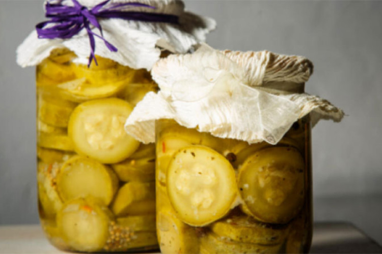 Potom vadite kolutove tikvica i ređajte ih u sterilisane tegle, a poslije svakog trećeg reda stavite mirođiju, čen bijelog luka i malo bibera. Prelijte mješavinom sirćeta i vode u kojoj su se tikvice kuvale, pa zatvorite.
