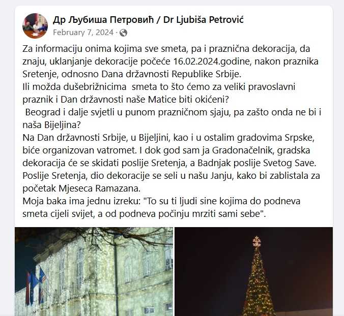 “Za informaciju onima kojima sve smeta, pa i praznična dekoracija, da znaju, uklanjanje dekoracije počeće 16.02.2024.godine, nakon praznika Sretenje, odnosno Dana državnosti Republike Srbije. Ili možda dušebrižnicima smeta to što ćemo za veliki pravoslavni praznik i Dan državnosti naše Matice biti okićeni?”, naveo je on.