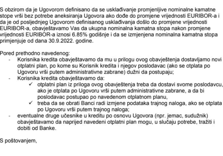 “S obzirom da je Ugovorom definisano da se usklađivanje promjenljive nominalne kamatne stope vrši bez potrebe aneksiranja Ugovora ako dođe do promjene vrijednosti EURIBOR-a i da je od posljednjeg Ugovorom definisanog usklađivanja došlo do promjene vrijednosti EURIBOR-a, obavještavamo Vas da ukupna nominalna kamatna stopa nakon promjene vrijednosti EURIBOR-a iznosi 6,85 odsto godišnje i da se izmijenjena nominalna kamatna stopa primjenjuje od dana 30. septembra 2022. godine”, navodi se u obavještenju ove banke.