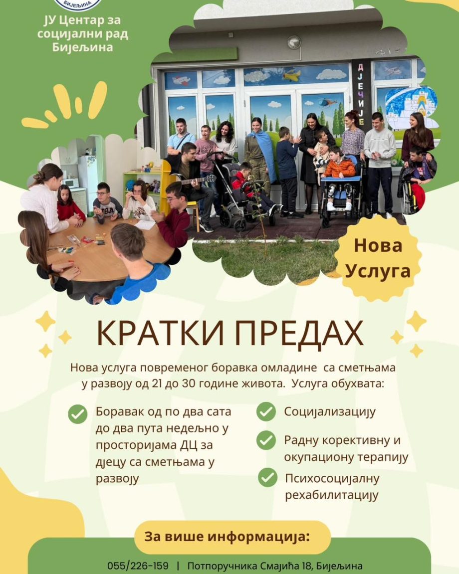 Centar za socijalni rad Bijeljina započeo je sa pružanjem nove usluge “Kratki predah“. Usluga je namijenjena omladini sa smetnjama u razvoju, uzrasta od 21 do 30 godina koja žive u porodici.
