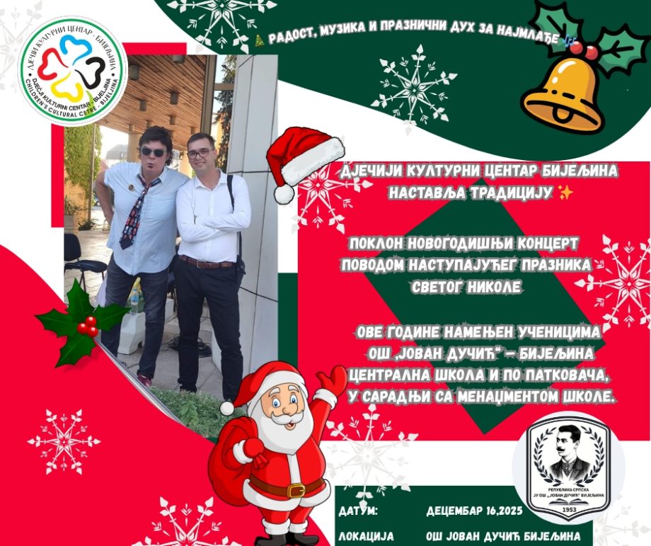 Dječiji kulturni centar Bijeljina nastavlja lijepu tradiciju darivanja najmlađih novogodišnjim poklon koncertima, koji će ove godine biti održani u utorak, 16. decembra 2025. godine, na dvije lokacije zbog velikog interesovanja djece.