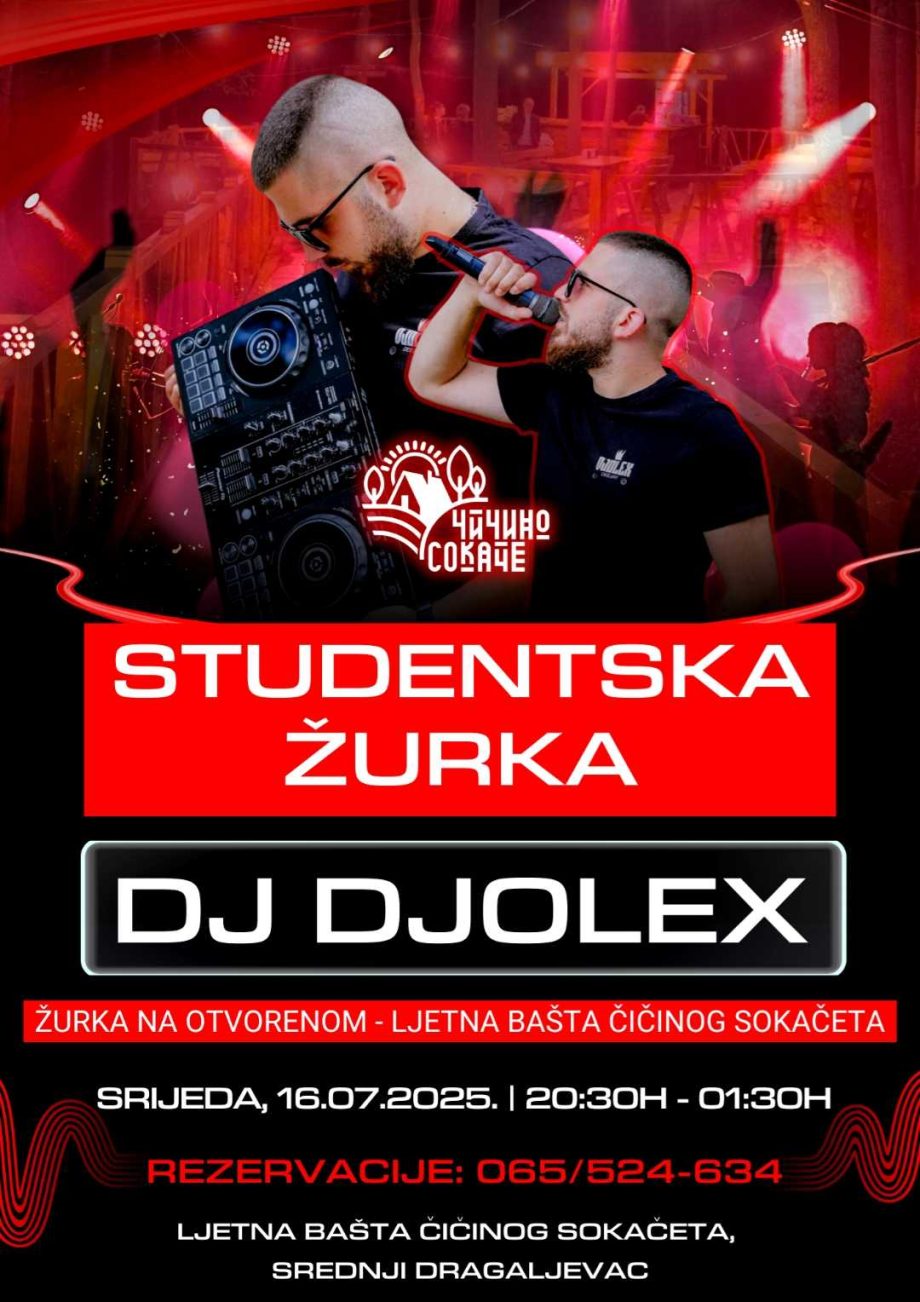 U srijedu, 16. jula, od 20:30 do 01:30 časova, rezervisana je noć za sve ljubitelje urbanog zvuka i elektronske muzike. Na scenu stiže DJ Djolex, čije nastupe krase snažan ritam, energija i ritmovi koji podižu atmosferu već od prve pjesme. Studentska žurka u Sokačetu nudi sve što je potrebno za nezaboravno veče: dobru muziku, otvoreni prostor, rasvjetu i odličnu energiju.