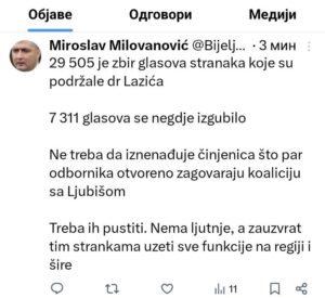 Bivši predsjednik GrO Bijeljina Miroslav Milovanović oglasio se na “Iks“ mreži sa jasnom porukom, da bivšim koalicionim partnerima u Bijeljini koji otvoreno dogovaraju saradnju u narednom periodu sa Ljubišom Petrovićem u gradskoj vlasti treba uzeti sve funkcije na regiji i šire.