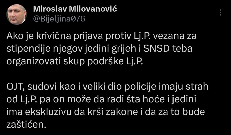 “Ako je krivična prijava protiv Lj.P. vezana za stipendije njegov jedini grijeh i SNSD teba organizovati skup podrške Lj.P.”, napisao je Milovanović, misleći na gradonačelnika Bijeljine.