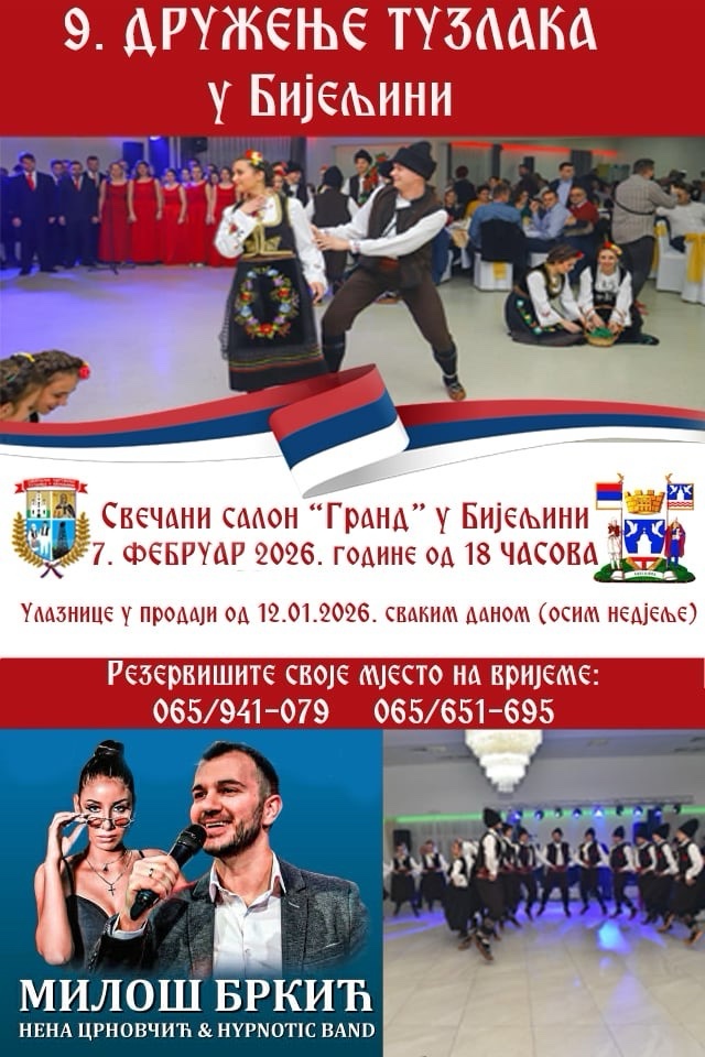 Zavičajno udruženje Tuzlaka u Bijeljini, pod pokroviteljstvom Grada Bijeljina, deveti put organizuje tradicionalno veliko druženje Tuzlaka, koje će biti održano u subotu, 7. februara 2026. godine, u Svečanom salonu „Grand“ u Bijeljini, sa početkom u 18.00 časova.
