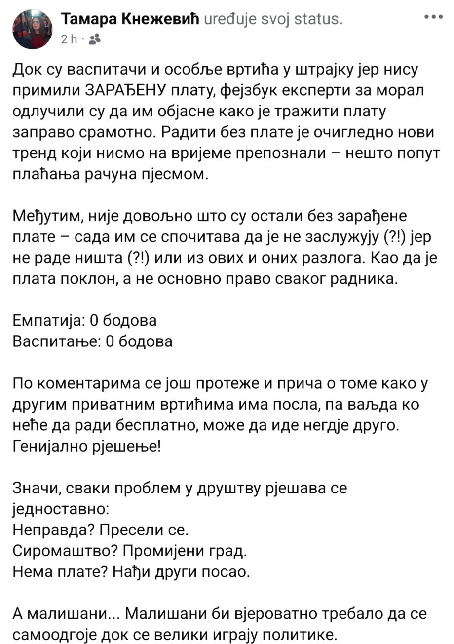 „Dok su vaspitači i osoblje vrtića u štrajku jer nisu primili ZARAĐENU platu, fejzbuk eksperti za moral odlučili su da im objasne kako je tražiti platu zapravo sramotno. Raditi bez plate je očigledno novi trend koji nismo na vrijeme prepoznali – nešto poput plaćanja računa pjesmom. Međutim, nije dovoljno što su ostali bez zarađene plate – sada im se spočitava da je ne zaslužuju (?!). Kao da je plata poklon, a ne osnovno pravo svakog radnika“, napisala je Tamara na društvenim mrežama.