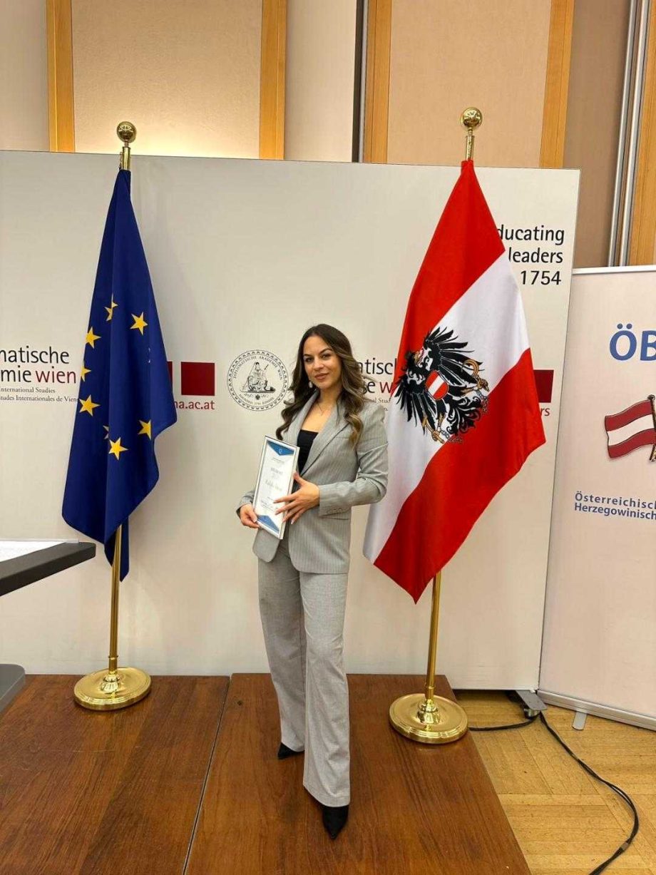 “Trenutno sam pri samom kraju studija i u početnoj fazi izrade master rada. Tokom studiranja susretala sam se sa brojnim izazovima i preprekama, kako na akademskom, tako i u ličnom smislu. Ipak, sve te teškoće su me očvrsle i doprinijele su mom ličnom i profesionalnom razvoju. Danas, s ponosom, mogu reći da se nisam pokajala zbog svog izbora. Posebno zadovoljstvo i satisfakciju za mene predstavlja to što sam dobitnik nagrade “Najbolji student Austrije 2025. godine porijeklom iz BiH”, koju dodjeljuje Bosansko akademsko društvo u Austriji. Nagrada mi je uručena trećeg oktobra na svečanoj ceremoniji u Diplomatskoj akademiji u Beču, a dodjeljuje se na osnovu najboljeg prosjeka ocjena tokom dosadašnjeg studiranja. Ova nagrada je potvrda mog dosadašnjeg rada i usavršavanja, ali i dokaz da se trud, posvećenost i upornost uvijek isplate”, ističe Rada Ivković.