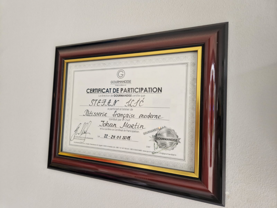Stefan je dobio i brojna priznanja, a jedno od tih smo i fotografisali u ateljeu. Stekao ga je na master predavanjima koja su držali neki od najvećih poslastičara.