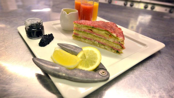 Ovaj ekstravagantni užitak za doručak nastaje slaganjem jastoga i dagnji između slanih palačinki s okusom cvekle i vlasca prelivenih kremastim sirom i beluga kavijarom.