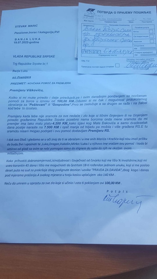 Stevan Marić penzioner, borac prve kategorije i ratni vojni invalid, uputio je pismo predsjedniku Vlade Srpske Radovanu Viškoviću, u kome, kako ističe, novčanu pomoć od 100 KM namijenjenu borcima, on poklanja predsjedniku Vlade.