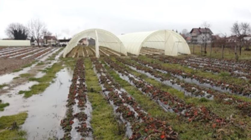 Bekir Sofić, proizvođač jagoda, pokušava da spasi barem nešto od ovogodišnjeg roda. Visina vode na njegovoim imanju bila je više od pola metra, piše BHRT.