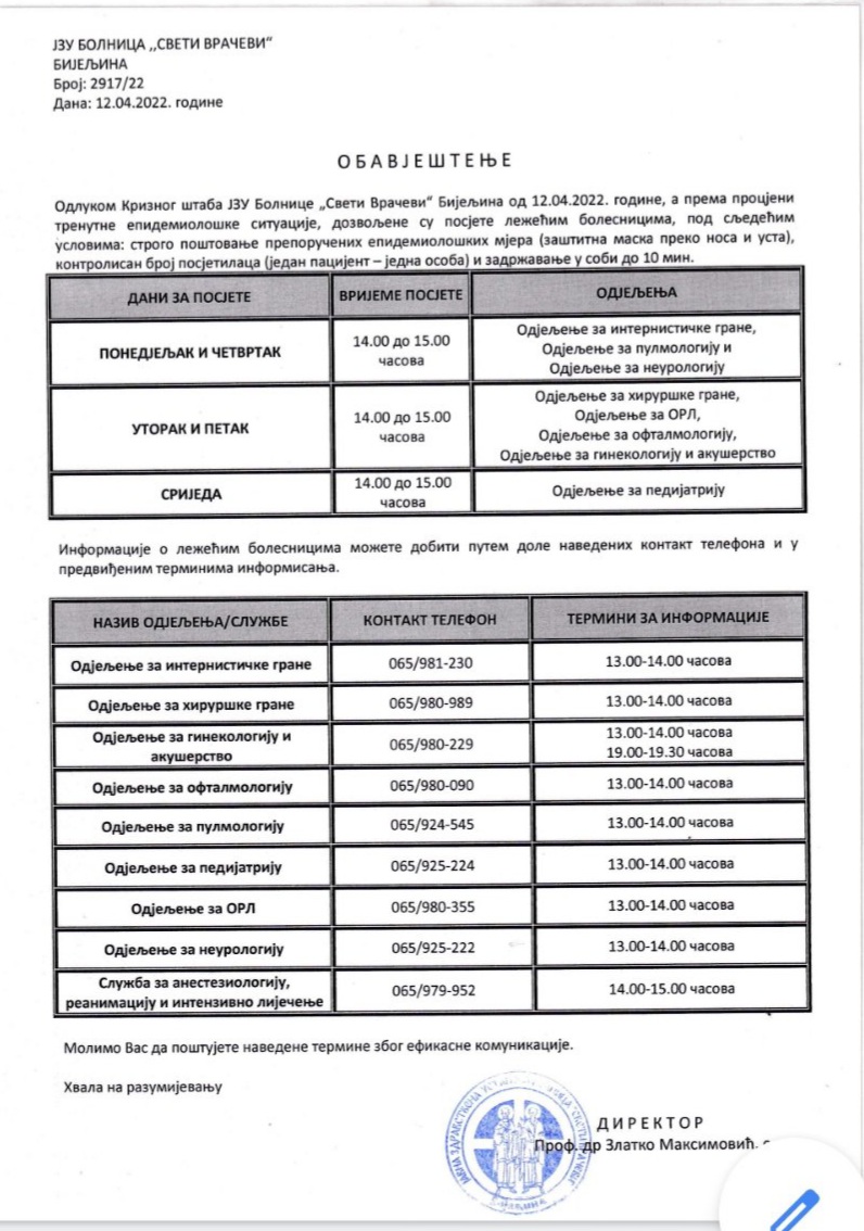 Nakon današnje objave da su na UKC RS dozvoljene posjete, ekipa portala Bijeljina.com je provjerila kakva je situacija u bijeljinskoj bolnici „Sveti vračevi“.