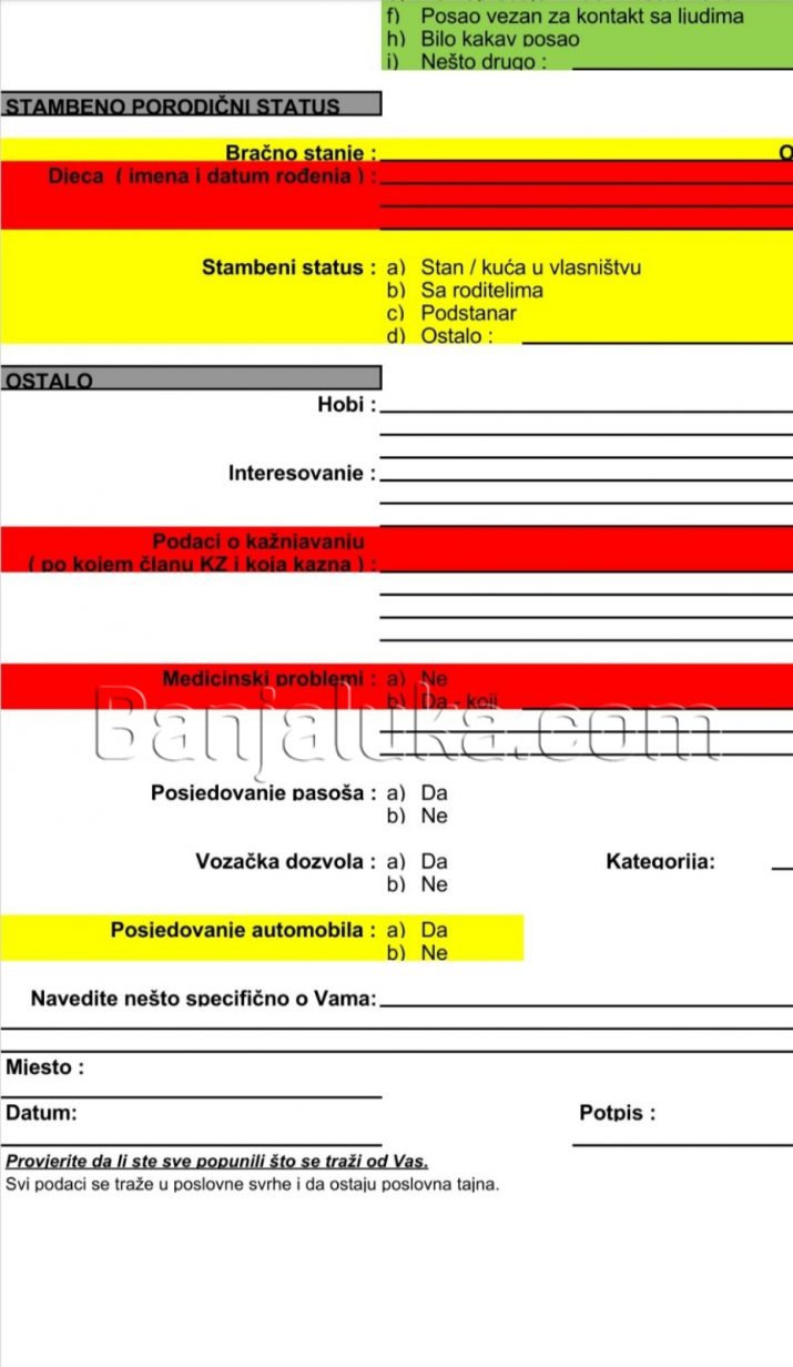 Na prijavnom formularu za posao poznate banjalučke kompanije pojavila su se, po mnogima, i neprimjerena pitanja. Dok jedni tvrde da je riječ o čistoj diskriminaciji, drugi su mišljenja da sve zavisi od usmenog odgovora kandidata.