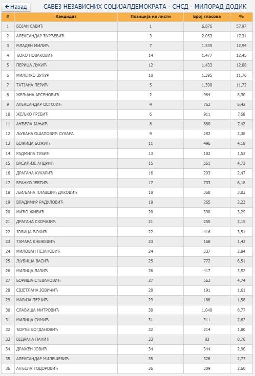 Trenutno najviše glasova ima Savez nezavisnih socijaldemokrata 11.862 odnosno 21,43 odsto, iza njih Srpska demokratska stranka 9.794 glasa odnosno 17,69 odsto, na trećem mjestu je Demos sa osvojenih 5.755 glasova, što je 10,40 odsto.