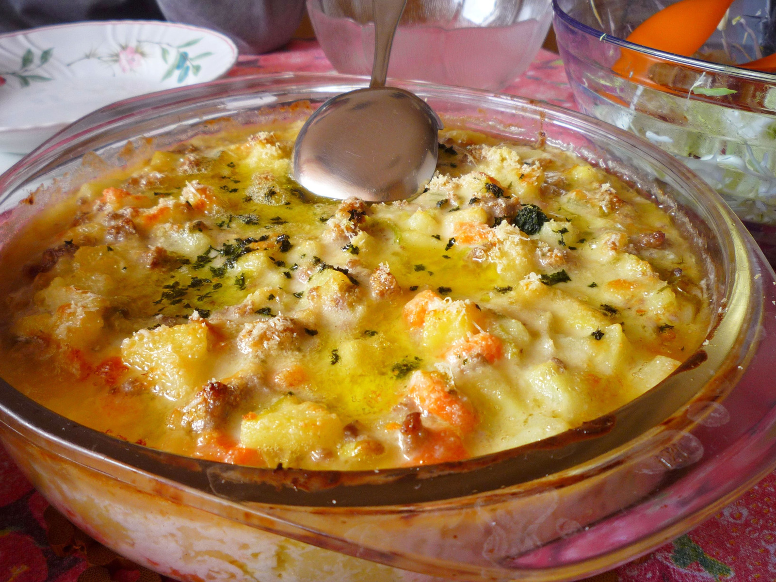 U vatrostalnu posudu ( ili po želji neku drugu ) staviti ocijeđene krompire i mrkvu, dodati meso s prazilukomte sve preliti bijelim umakom. Dobro promiješati, na vrh staviti nekoliko komadića maslaca, posipati isjeckanim peršunom i ribanim parmezanom.