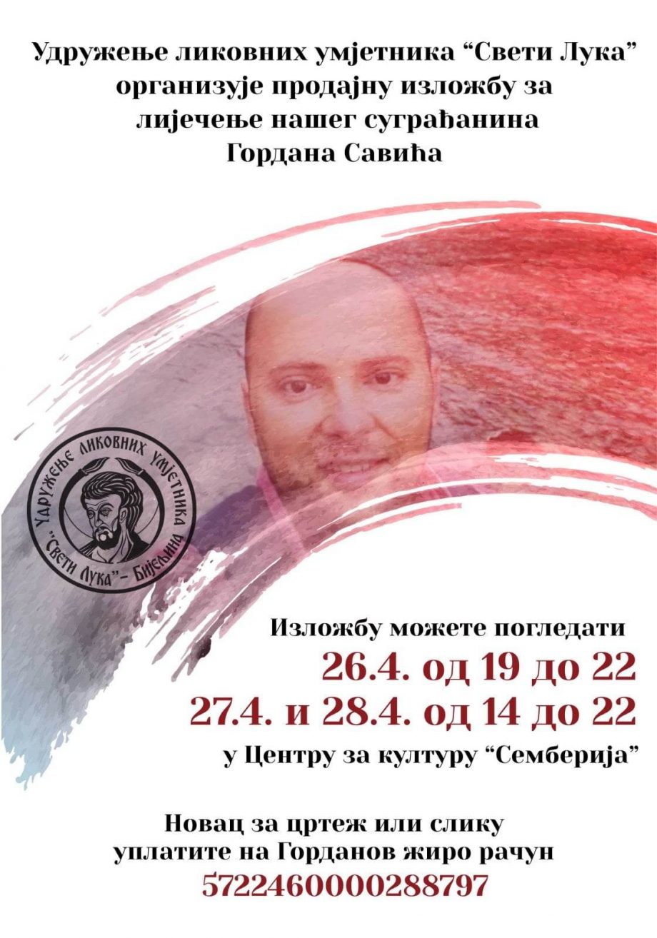 Udruženje likovnih umjetnika “Sveti Luka” Bijeljina organizuje prodajnu izložbu za liječenje sugrađanina Gordana Savića, najavljeno je iz Centra za kulturu “Semberija”.