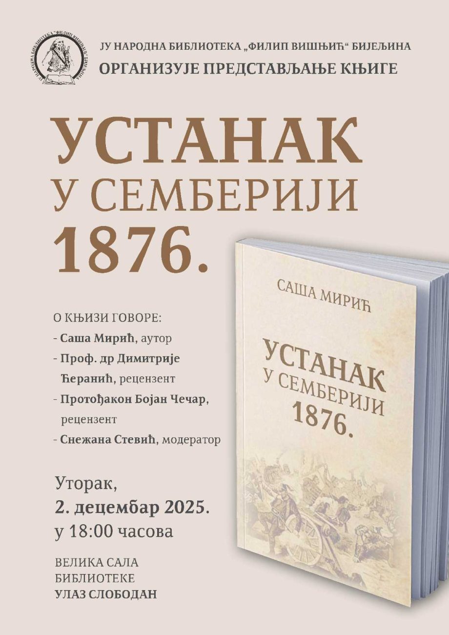 Promocija knjige „Ustanak u Semberiji 1876.“, autora i istoričara Saše Mirića, biće održana u utorak, 2. decembra 2025. godine, sa početkom u 18.00 časova u Narodnoj biblioteci „Filip Višnjić“ u Bijeljini.