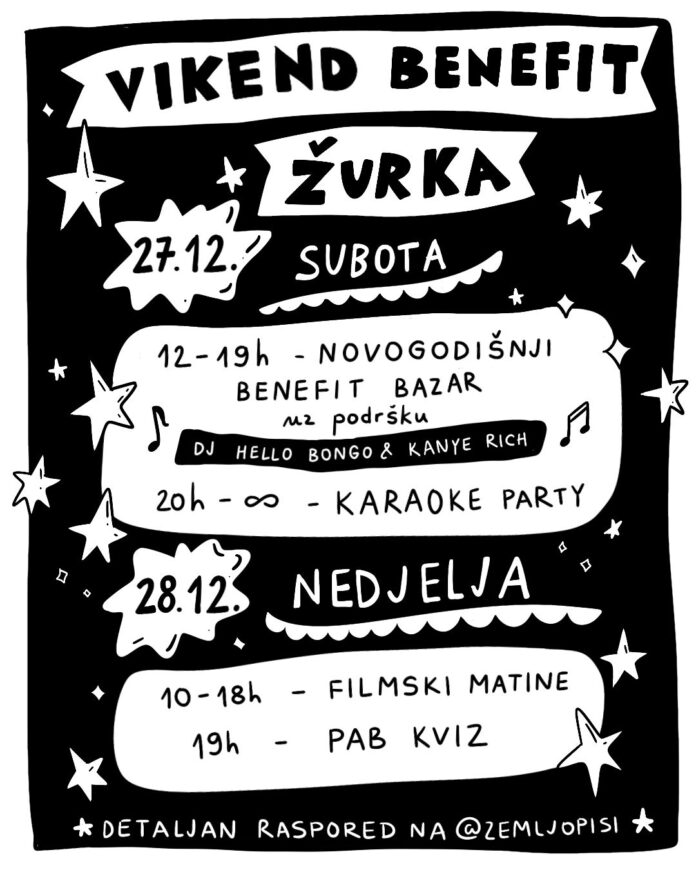 Benefit žurka je zabava sa plemenitim ciljem, gdje se njeguje solidarnost i gradi zajednica. Sav prihod od donacija usmjerava se u društveno korisne svrhe. Sav prikupljeni novac poslužiće za nastavak projekta Zemljopisi, serije kulturnih večeri u Bijeljini. Mali biznisi su se još jednom pridružili dobrotvornim akcijama za razvoj zajednice i kulturnog sadržaja u našem gradu, i donirali svoje proizvode i usluge koji se mogu naći na novogodišnjem benefit bazaru.