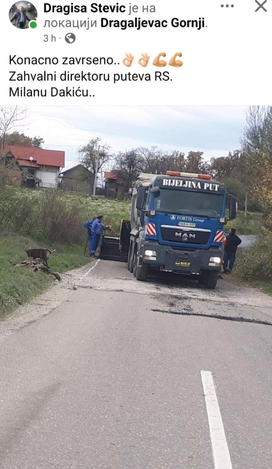 Na svom Facebook nalogu, mještanin Gornjeg Dragaljevca, Dragiša Stević, napisao je: “Konačno završeno, zahvalni direktoru Puteva RS Milanu Dakiću.”