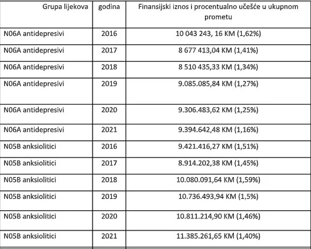 Prema zvaničnim podacima državne Agencije za lijekove i medicinska sredstva (ALMBiH) iz novembra 2022. godine, a za evidenciju iz 2021., uvezenih i proizvedenih antidepresiva i lijekova za smirenje bilo je u vrijednosti oko 22,6 miliona maraka.