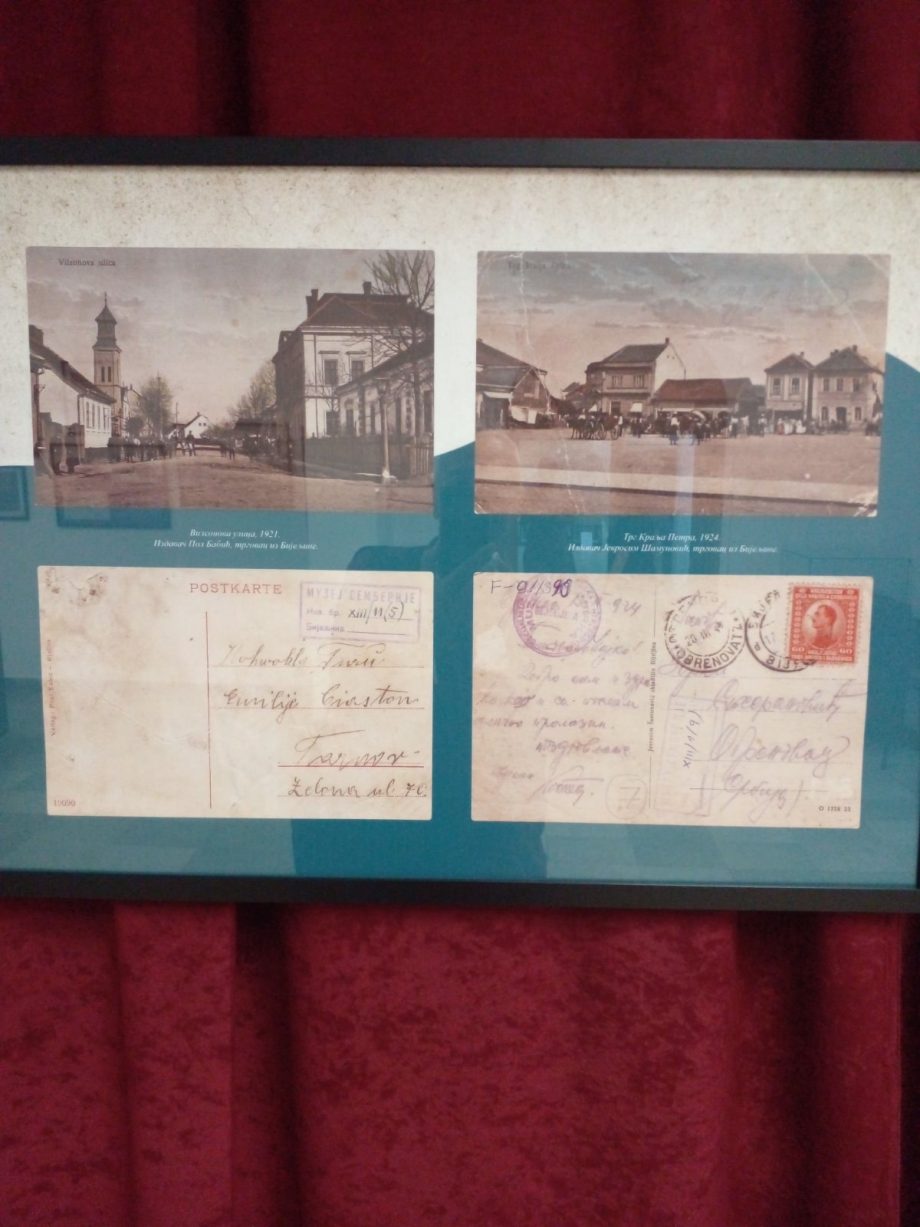 Najstarija razglednica je reprint koji prikazuje zgradu Konaka, odnosno današnjeg Muzeja Semberije i zgradu tadašnje Komunalne škole. Ona je nastala 1886. godine i na pozadini je ispisano ime izdavača Švidernoha iz Beča. Zanimljive su i razglednice Vilma ulice, iz 1912. godine, te pijace mesa i povrća iz 1915. godine, izdavača Arpada Vaila. Inače, Muzej Semberije posjeduje kolekciju razglednica sa više od 1.500 primjeraka. One imaju izuzetnu dokumentarnu vrijednost za proučavanje brojnih naselja bivše Jugoslavije, zemalja svijeta i primarno Bijeljine od kraja 19. vijeka do danas.
