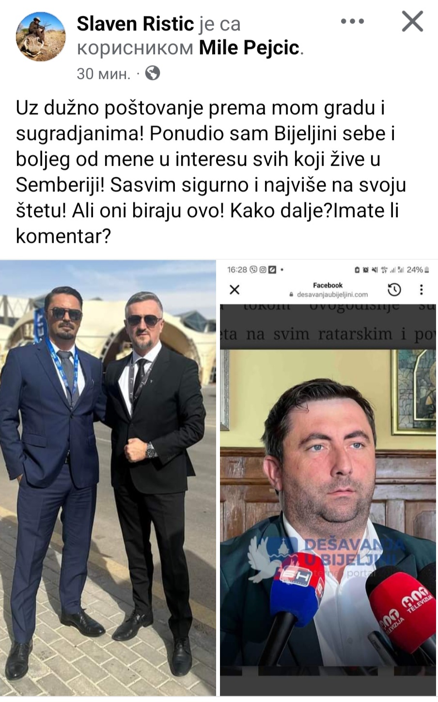 On je uz objavu okačio i dvije fotografije – Jednu na kojoj je on sa Miletom Pejčićem, direktorom TRB-a i kandidatom RSS-a za gradonačelnika Bijeljine, i drugu na kojoj je Ljubiša Petrović, stari/novi gradonačelnik Bijeljine.