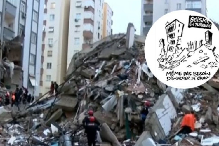 Na Tviter nalogu magazina je kao crtež dana podijeljena karikatura umjetnika Juina koja prikazuje srušenu zgradu, oštećeni automobil i hrpu ruševina s natpisom: “Nema potrebe za slanjem tenkova”. Umjetnik se očigledno referirao na to što je zemljotres pogodio dio Turske i Sirije u kojem žive Kurdi, a s kojima se turska vlast već godinama bori.