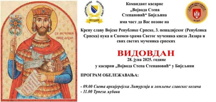 Na Vidovdan će u kasarni “Vojvoda Stepa Stepanović” u Bijeljini biti obilježena i krsna slava Vojske Republike Srpske 3. pješadijskog (Republika Srpska) puka i Spomen – hrama Svetog mučenika kneza Lazara i svih svetih mučenika srpskih.