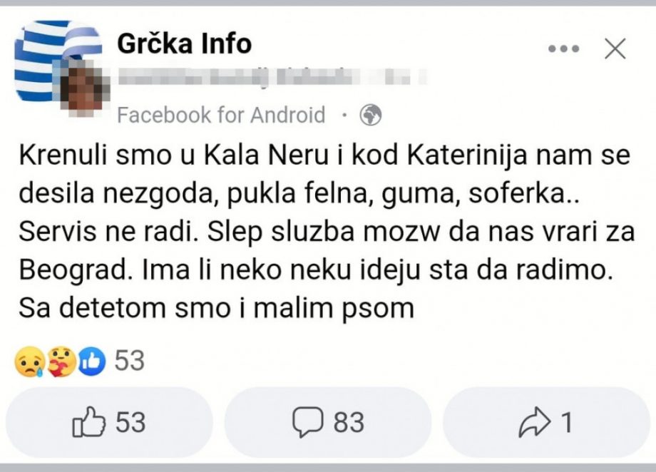 Jedna beograđanka se sopstvenim prevozom prije nekoliko dana zaputila na odmor u Grčku u Kala Neru i, kako je navela u grupi “Grčka info”, kod Katerinija joj se desila saobraćajka, zbog čega su joj na automobilu pukle felna, guma i šoferka. Da stvar bude gora, servis u tim trenucima nije radio, a bilo joj je nezgodno da čeka šlep-službu koja bi mogla da je vrati za Beograd jer je u kolima bila sa djetetom i psom.