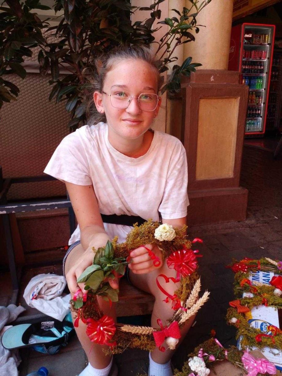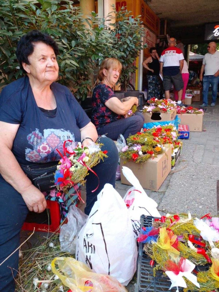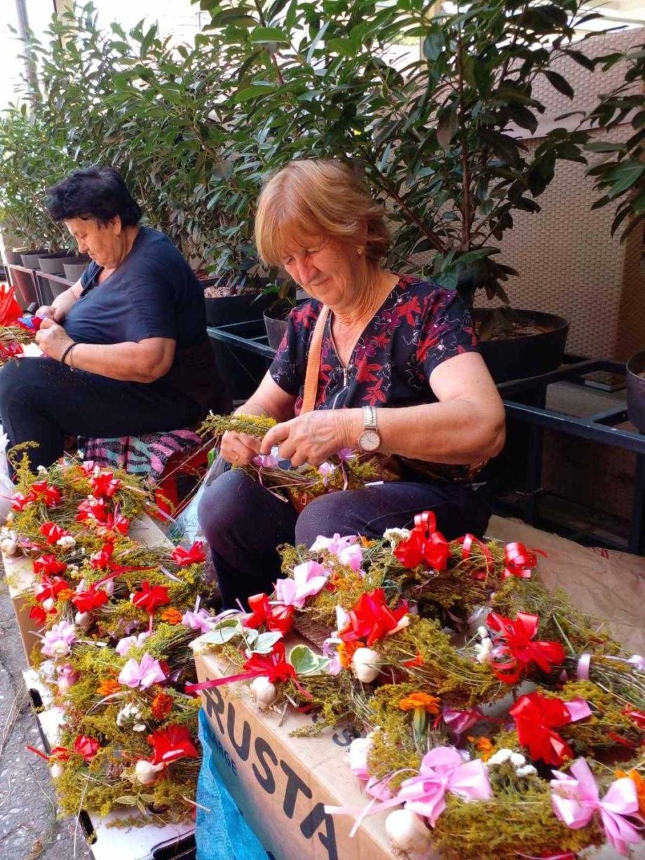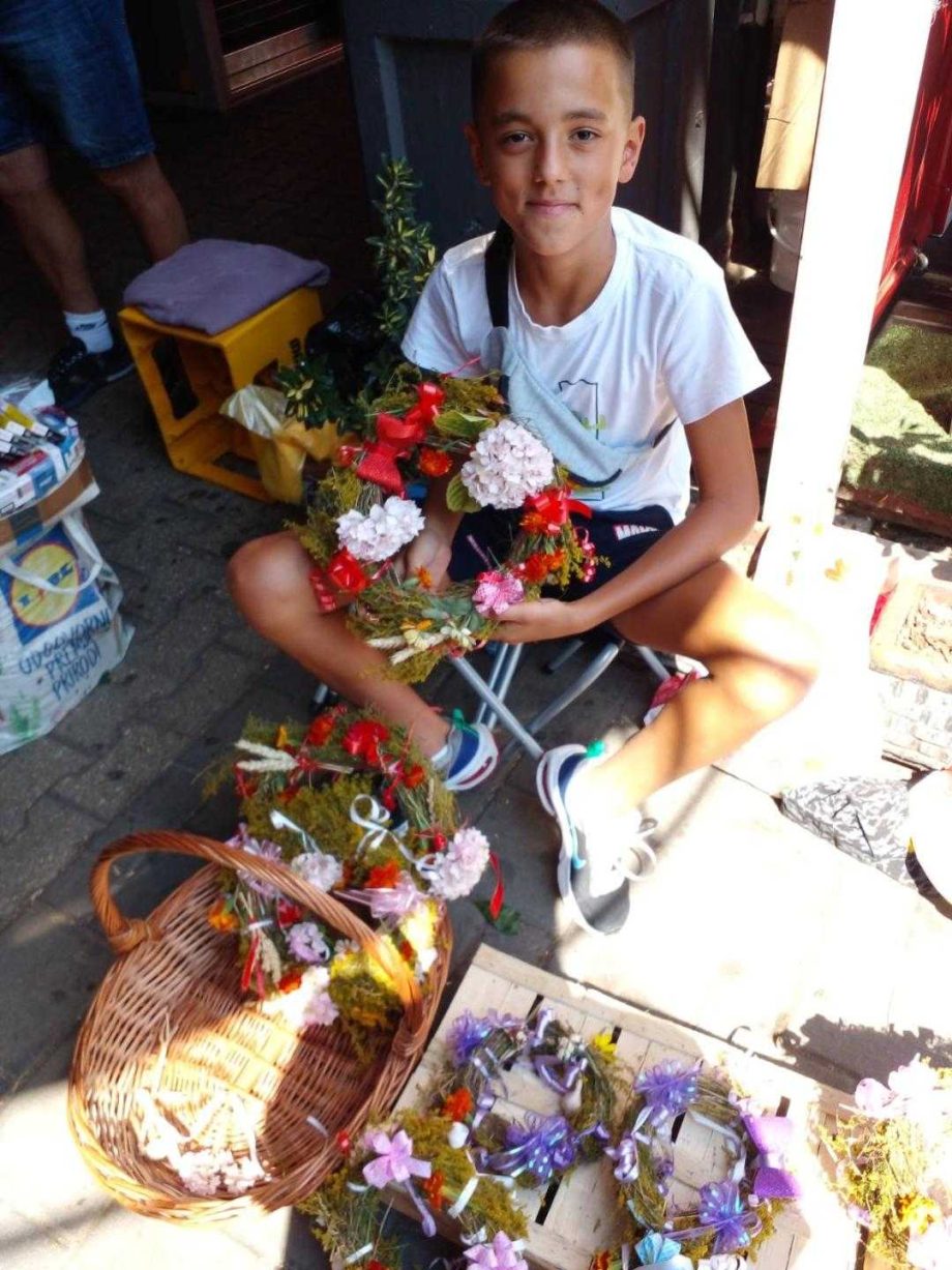 Marija i Đorđe, osnovci, na ulazu uZzelenu pijacu prodaju vjenčiće koje su isplele njihove majke i bake.